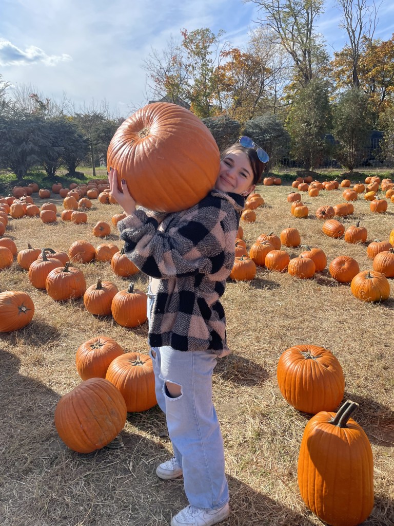 Amanda Saba at a pumpkin patch holding a pumpkin. Photo by Amanda Saba